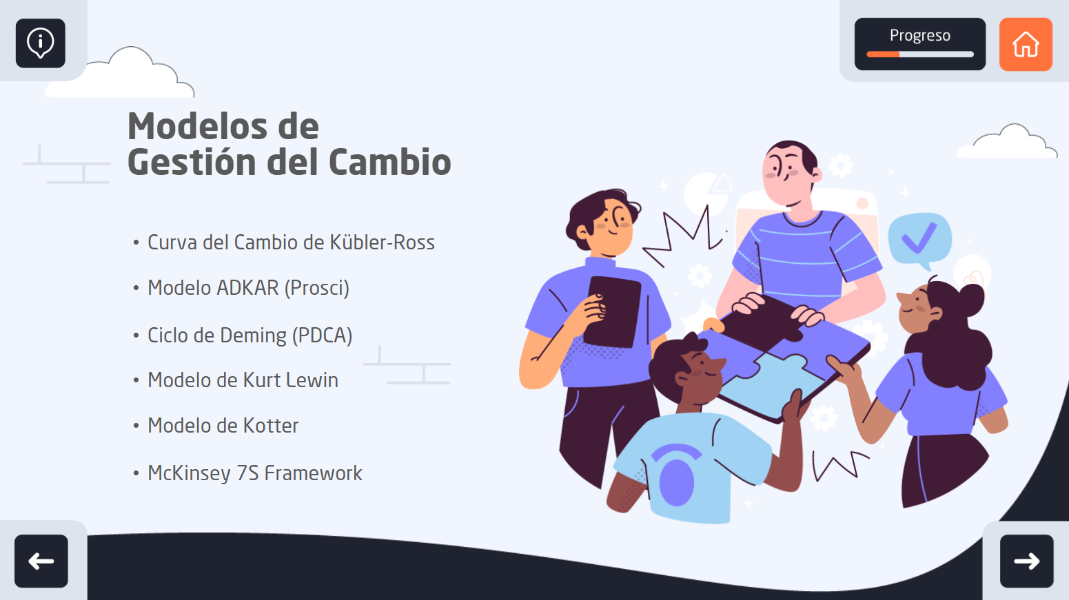 Este curso proporciona conocimientos y estrategias clave para gestionar eficazmente los cambios dentro de una organización, abordando los desafíos que surgen en los procesos de transformación. A través de modelos y metodologías estructuradas, enseña cómo minimizar la resistencia al cambio, facilitar la adaptación de los equipos y garantizar la sostenibilidad de nuevas prácticas, asegurando que las organizaciones se mantengan competitivas y eficientes en entornos dinámicos.